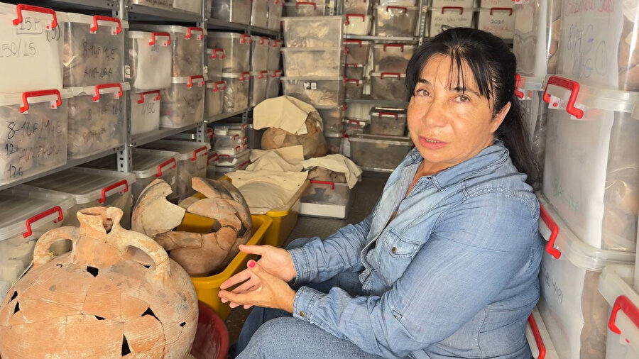 Prof.Dr. Aydıngün, üretim atölyesi olarak alanın nitelendirilebilmesi için bir takım kriterlere sahip olması gerektiğini belirtti. Zeytin ya da üzümün presleme malzemeleri, bir yerden getirilip serildikten sonra onun düzgün bir platformda sıkılması, preslenmesi gerektiğini anlatan Prof.Dr. Şengül Aydıngün “Sonrasında sıkılacak zeytin ya da üzümün toplandığı bir yer gerekiyor bu yüzden de ya tanklar ya da havuzlar olması gerekiyor. Geçen yıl havuzlu bir mekan bulmuştuk. Bu yıl hemen onun yanında daha küçük çok daha şık bir aslan başı ile süslenmiş bir akıtacak, yine düz bir platform ve aslanın ağzından akan sıvıların bir havuza aslında bir fermante havuzuna boşaldığı bir mekanla karşılaştık. Bu bizi çok heyecanlandırdı. Bir taraftan sanatsal bir işçilik görüyoruz. Bir taraftan da giderek büyüyen bir imalathane görüyoruz. Sıkma platformları, havuzlar, depolama birimleri derken, o havuzda birikmiş sıvının sonrasında dağıtımı gerekiyor. Bu dağıtım ne şekilde yapılıyor burada gördüğünüz amphoralarla (iki kulplu, Antik dönemlere özgü bir çeşit Yunan çömleği) aynı yerde pek çok amphora bulduk. Bunların da restorasyonu yapılıyor arkadaşlarımız tarafından. Amphoraların bazılarının üzerinde üretim yerleri ve yıllık da yazar. Bu amphoralar pek çok cam kadehler belli ki orada içimi de yapılmış. Hatta havuzun içine atılmış hayvan kemikleri de gördük. Dini ritüellerde de kullanılmış belli ki. Çok özel bir yerle karşı karşıyayız. Bathonea’nın sürprizlerinden biri de bu yıl, zeytin yağı, ya da şaraphanenin giderek büyüyor olması" diye konuştu.
