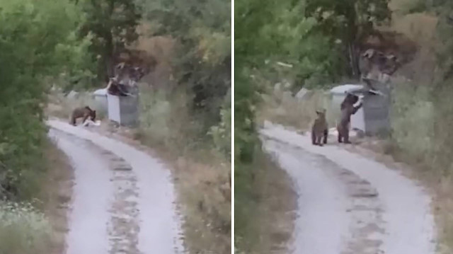 Görüntülerde, yiyecek arayışındaki ayının çöp konteynerine yaklaşarak içindekileri etrafa saçtığı anlar net şekilde görüldü. "Gülümseyin çekiyorum" diyen vatandaş ayıların o anlarını cep telefonuyla kaydetti.