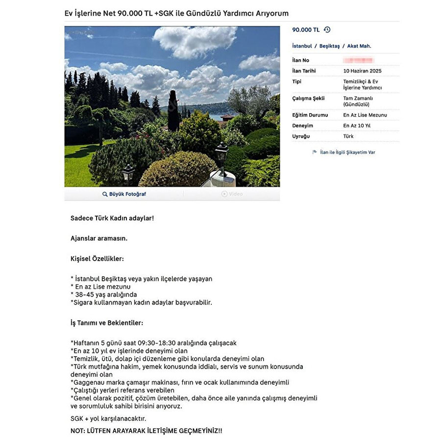 İstanbul Beşiktaş’tan verilen ve bir ilan sitesinde yayımlanan hizmetçi ilanı, sosyal medyada büyük yankı uyandırdı. İlana göre ev işlerinde çalışacak 'gündüzlü yardımcı' için teklif edilen maaş tam 90 bin TL üstelik sigorta da cabası.