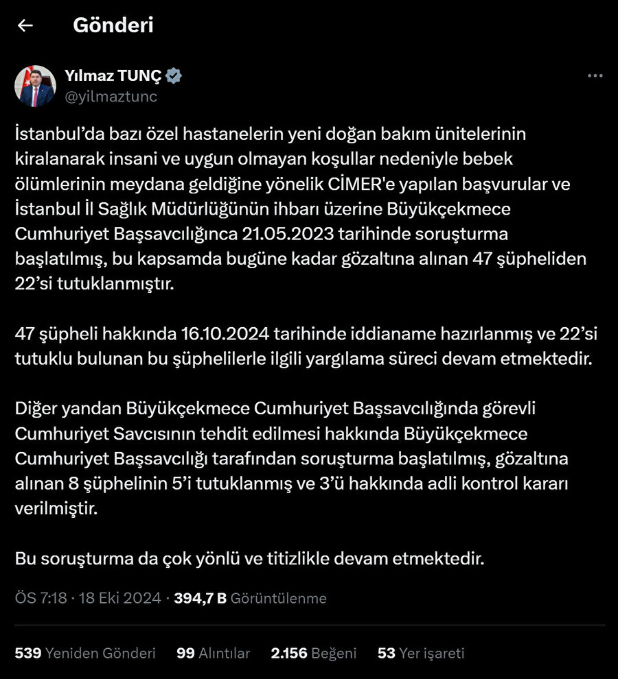 Adalet Bakanı Yılmaz Tunç, sosyal paylaşım sitesi X hesabından yaptığı paylaşımda, “İstanbul’da bazı özel hastanelerin yeni doğan bakım ünitelerinin kiralanarak insani ve uygun olmayan koşullar nedeniyle bebek ölümlerinin meydana geldiğine yönelik CİMER’e yapılan başvurular ve İstanbul İl Sağlık Müdürlüğünün ihbarı üzerine Büyükçekmece Cumhuriyet Başsavcılığınca 21 Mayıs 2023 tarihinde soruşturma başlatılmış, bu kapsamda bugüne kadar gözaltına alınan 47 şüpheliden 22’si tutuklanmıştır. 47 şüpheli hakkında 16 Ekim 2024 tarihinde iddianame hazırlanmış ve 22’si tutuklu bulunan bu şüphelilerle ilgili yargılama süreci devam etmektedir” dedi.