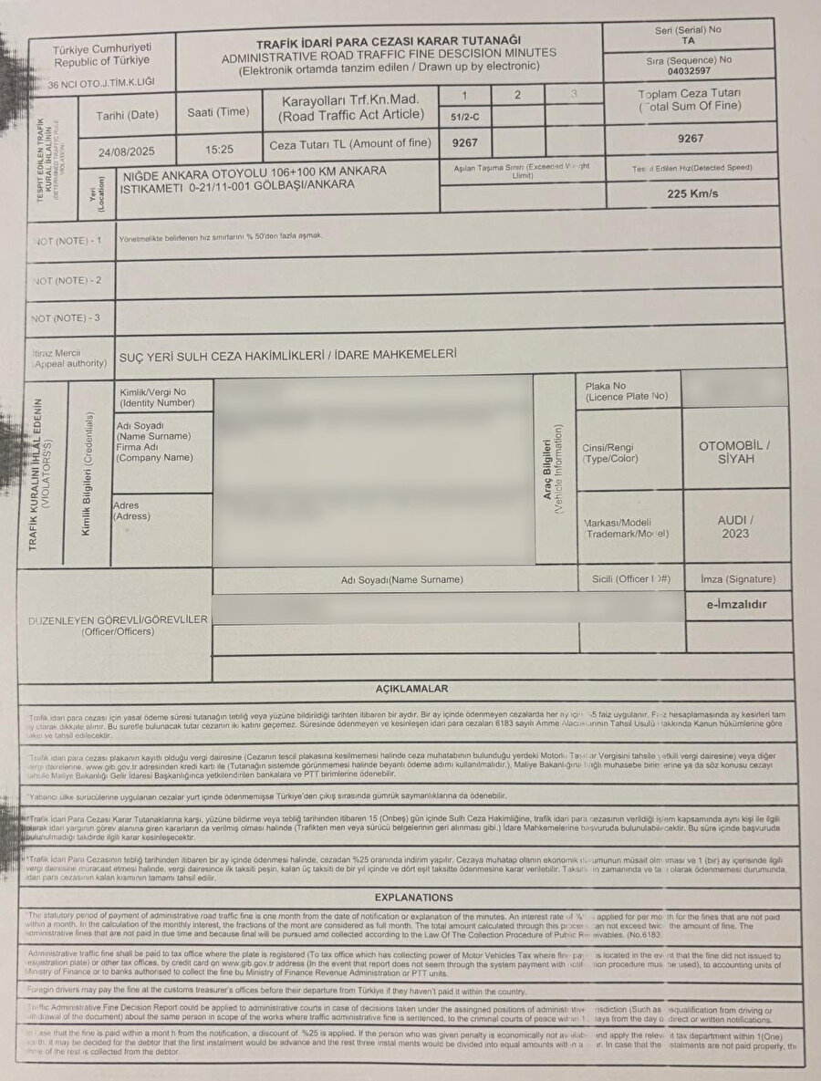 Ulaştırma ve Altyapı Bakanı Abdulkadir Uraloğlu, Ankara-Niğde Otoyolu'nda otomobilin direksiyonuna geçtiği esnada hız sınırını aştığı için jandarma tarafından ceza yazıldığını açıkladı.