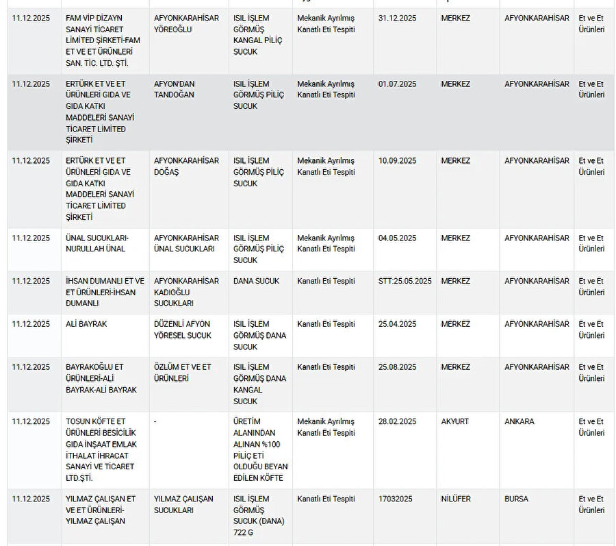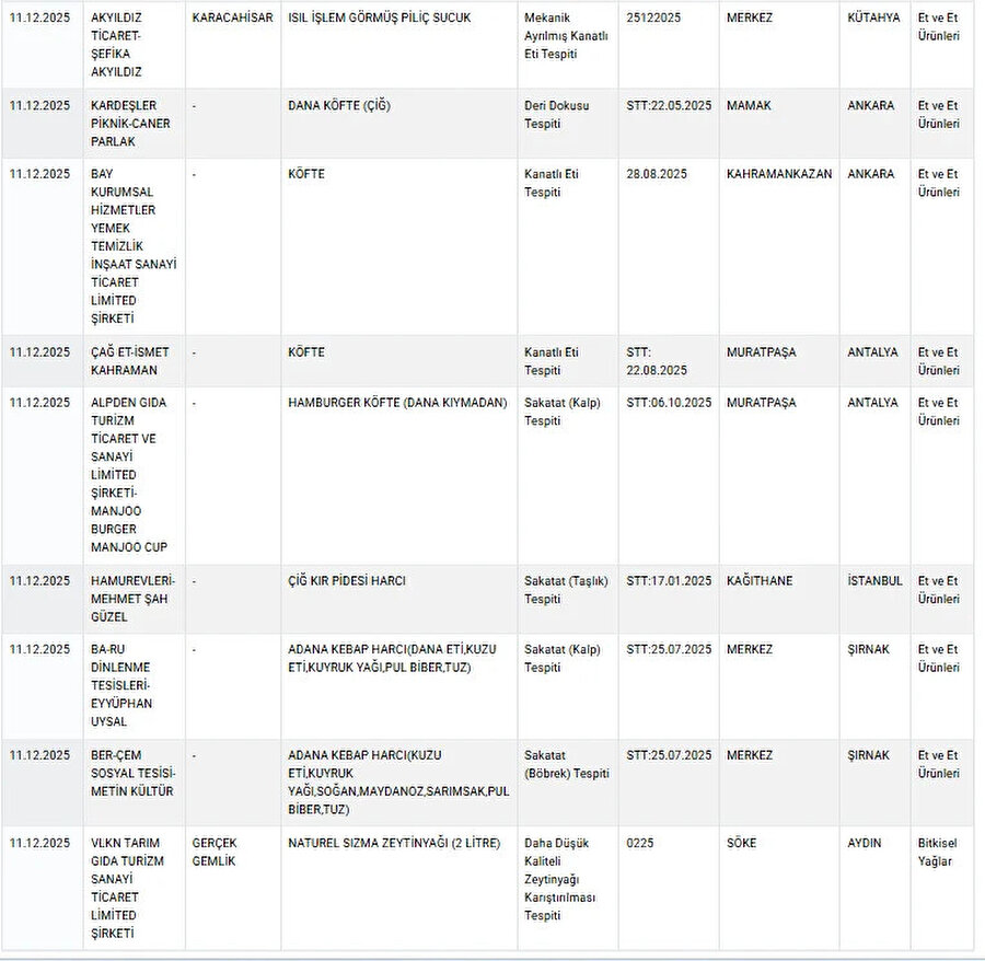 Bakanlık tarafından yapılan laboratuvar analizlerinde, bazı köfte ürünlerinde deri dokusu, sucuklarda kanatlı eti, dana kıyma olarak satılan ürünlerde ise sakatat (kalp) tespit edildi. Bu bulgular, tüketicinin yanıltıldığı ve ürünlerin etiket bilgileriyle uyuşmadığı gerekçesiyle kayıt altına alındı.