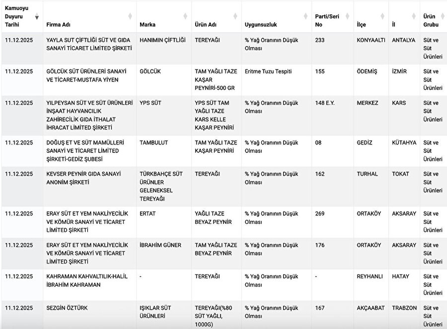 Açıklanan listede farklı illerde üretimi yapılan tam yağlı kaşar, beyaz peynir ve tereyağı ürünleri bulunuyor. Denetimler sonucunda bu ürünlerin etiket bilgileriyle içeriklerinin örtüşmediği ve tüketiciyi yanıltacak nitelikte olduğu belirlendi.