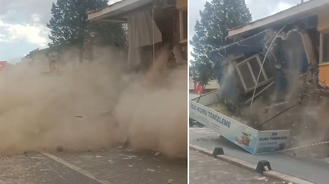 Balıkesir'in Sındırgı ilçesinde dün meydana gelen 6,1 büyüklüğündeki depremin ardından yaşanan artçı sarsıntılar nedeniyle daha önce boşaltılan 2 katlı binanın bir kısmının yıkılma anı cep telefonuyla kaydedildi.