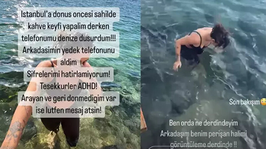 "Hepsi" grubunun eski üyelerinden Yasemin Yürük, arkadaşıyla sahilde kahve içerken telefonunu denize düşürdü. O anlarda büyük şaşkınlık yaşayan Yürük, hemen denize girerek telefonunu aramaya başladı. Denizin içinde çaresizce telefonunu aradığı anlar, arkadaşı tarafından kayda alındı.