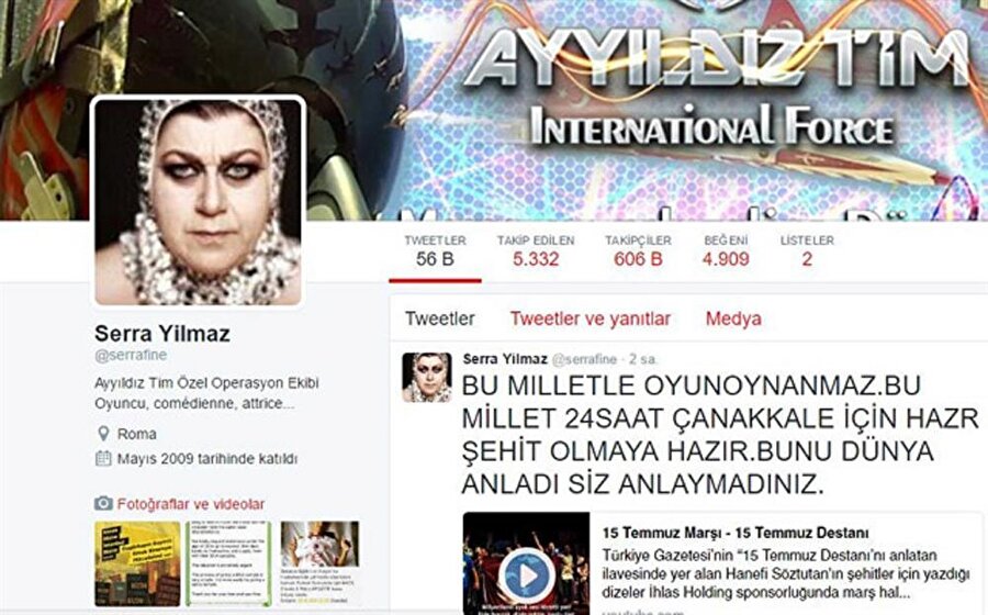 Başörtülü kadınları öcüye benzetme ve Türk olmak benim suçum değil gibi antipatik söylemleriyle bilinen tiyatro ve sinema sanatçısı Serra Yılmaz'ın twitter hesabı Ayyıldız Tim ekibi tarafından hacklendi.