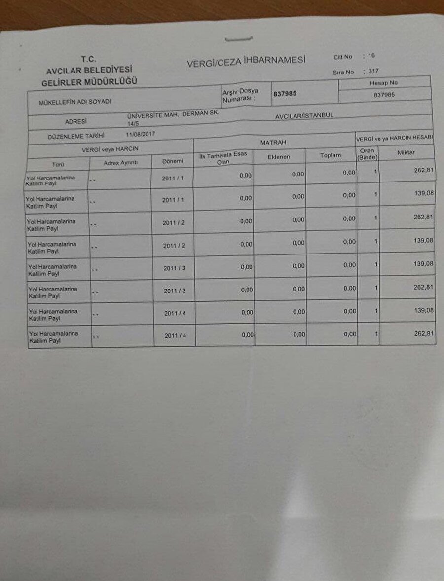 Konuya ilişkin açıklama yapan Ethem Balcı adlı vatandaş, Avcılar Belediye Başkanlığı Gelirler Müdürlüğü tarafından kendisine gönderilen 21 Ağustos 2017 tarihli bir ihbarname olduğunu ve dairesi için kaldırım parası istendiğini söyledi. Gönderilen ihbarnamede borcun ‘Yol Harcamalarına Katılma Payı’ olarak belirtildiğini ve 2011 yılına ait olduğu bilgisini veren Balcı, “8 ayrı kalemde kesilen bu borçlar benden gecikme faiziyle birlikte tahsil edilmek isteniyor. Ana borç 1.753 TL iken bu miktar faiziyle birlikte 3.052.44 TL’ye çıkmış” ifadelerini kullandı.