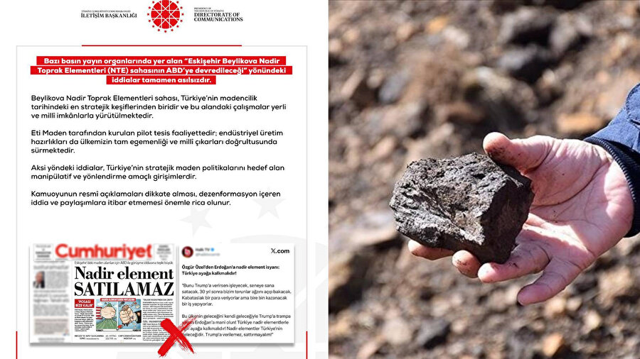 İletişim Başkanlığı Dezenformasyonla Mücadele Merkezi bazı basın yayın organlarında “Eskişehir Beylikova Nadir Toprak Elementleri (NTE) sahasının ABD’ye devredileceği” yönündeki iddiaları yalanladı.