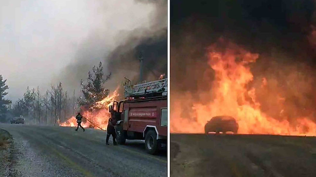 Muğla'nın Köyceğiz ilçesinde gece saatlerinde devam eden orman yangını sırasında, Pınar Mahallesi yakınlarında alevler aniden yola sıçradı. Yolda park halindeki, içinde kimse bulunmayan bir araç, bir anda alevlerin ortasında kaldı. İtfaiye ekiplerinin hızlı müdahalesi sayesinde araç tamamen yanmaktan son anda kurtarıldı.