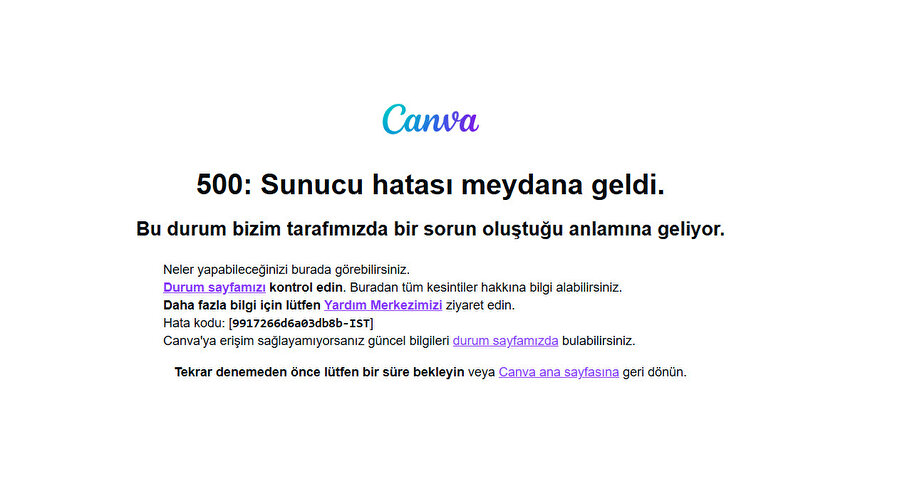 Sosyal medya grafikleri, sunumlar, posterler ve diğer görsel içerikleri oluşturmaya imkan sağlayan çevrimiçi grafik tasarım platformu Canva'ya bugün sabah saat 10.20'den beri erişim problemleri yaşanıyor. Kullanıcılar platforma bağlanmak istediklerinde "500 sunucu hatası meydana geldi" yazısıyla karşılaşıyor.