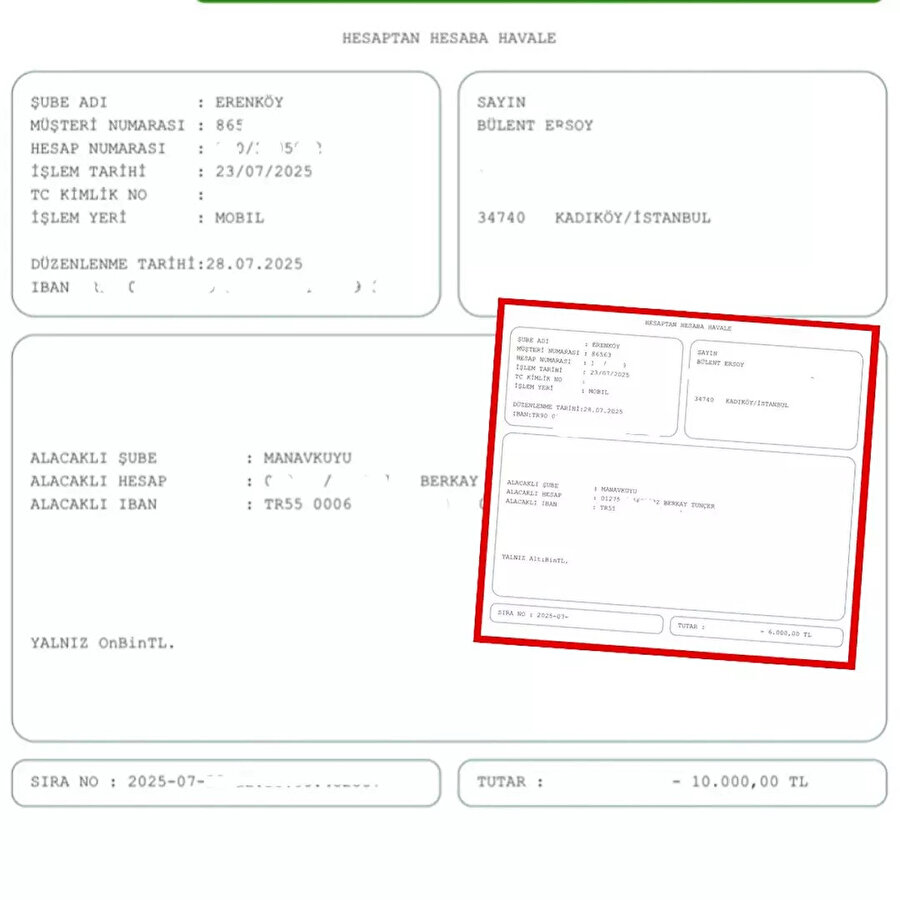 "İnsani duygularla acıdığım için gönderdiğim 16 bin lira hesabıma yatacak" diyerek net konuşan Bülent Ersoy, ayrıca hesabından yapılan ve toplamı 16 bin TL eden iki çıkışın da dekontunu paylaştı.