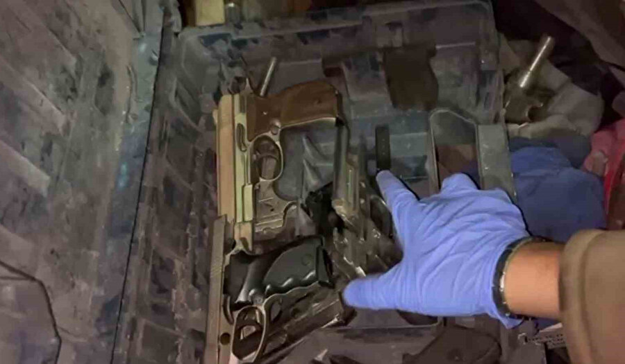 Yapılan aramada 5 ruhsatsız tabanca, 14 kurusıkı tabanca, 27 şarjör, 63 farklı çapta fişek ile silah yapımında kullanılan 14 araç-gereç ve 19 silah parçası bulundu.