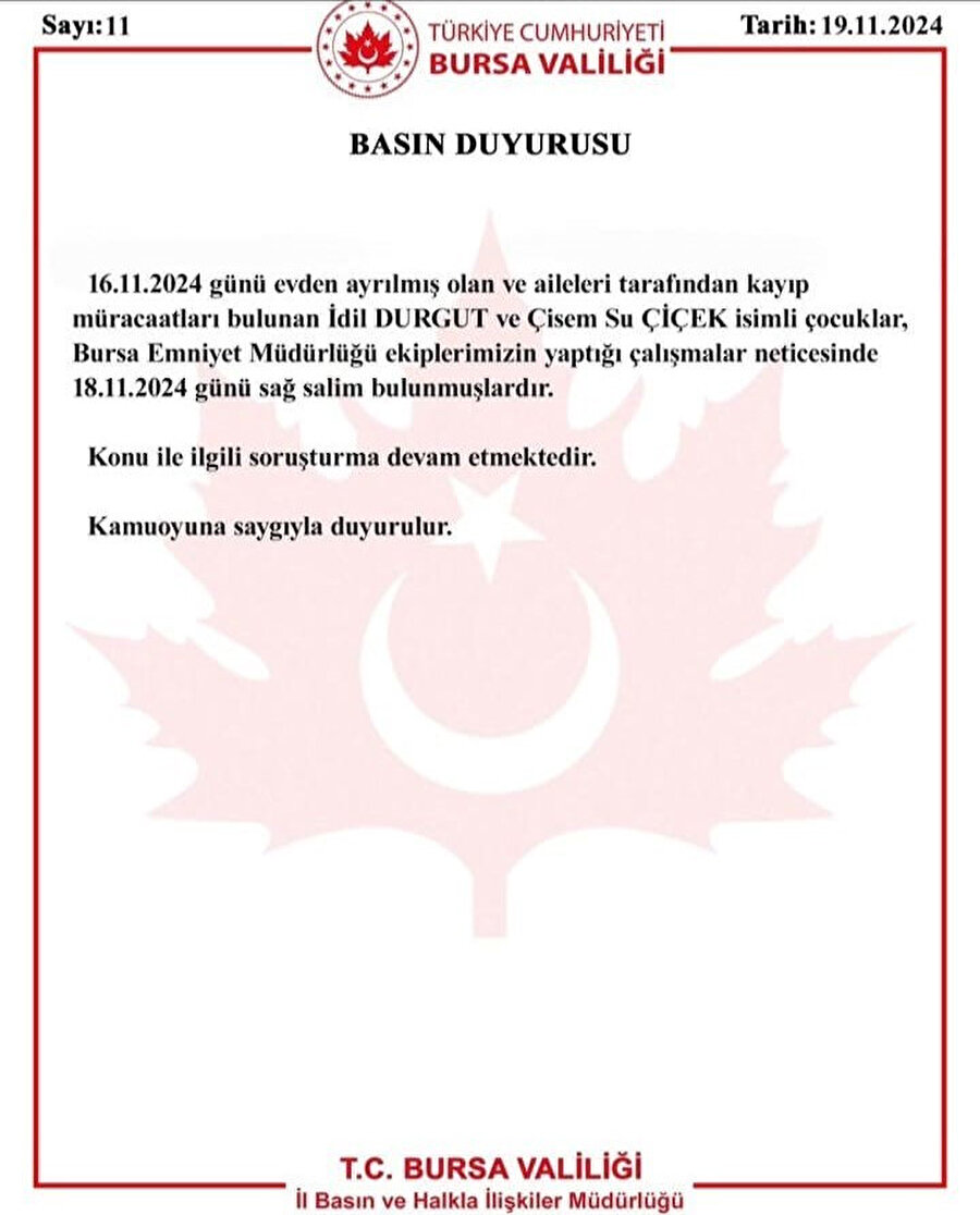 - "16.11.2024 günü evden ayrılmış olan ve aileleri tarafından kayıp müracaatları bulunan İdil Durgut ve Çisem Su Çiçek isimli çocuklar, Bursa Emniyet Müdürlüğü ekiplerimizin yaptığı çalışmalar neticesinde 18.11.2024 günü sağ salim bulunmuşlardır. Konu ile ilgili soruşturma devam etmektedir."