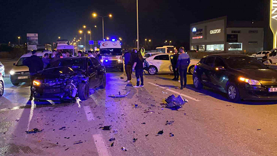 Çarpmanın etkisiyle hızlanan 16 BGN 709 plakalı otomobil de önündeki Ekrem Ö. (40) yönetimindeki 16 BJH 908 plakalı otomobile arkadan çarptı. 16 BJH 908 plakalı araç ise önündeki Mehmet G.’nin (36) kullandığı 16 AFZ 249 plakalı otomobile çarptı. 16 AFZ 249 plakalı otomobil de Ebubekir A. (25) yönetimindeki 16 BGV 505 plakalı hafif ticari araca çarptı.