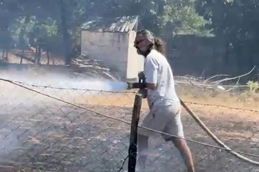 Çanakkale’de bir evin bahçesinde çıkan yangını söndürme çalışmalarına ünlü oyuncu Kenan Çoban da destek verdi.