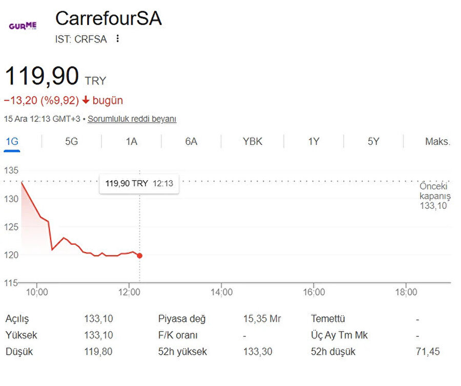 Güne 133,10 TL seviyesinden başlayan CarrefourSA hisseleri, gün içinde 119,80 TL’ye kadar geriledi. Saat 12.13 itibarıyla 119,90 TL’den işlem gören hisse, önceki kapanışa göre 13,20 TL düşüşle yaklaşık yüzde 9,9 değer kaybetti. Bu hareketle birlikte şirketin piyasa değeri yaklaşık 15,35 milyar TL seviyesine indi.