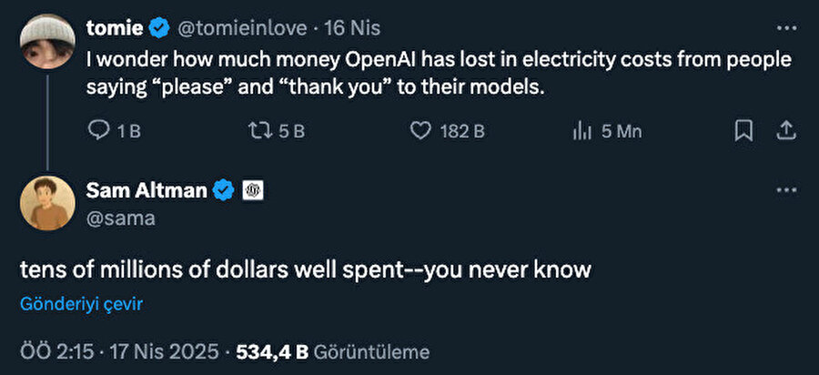 X platformunda bir kullanıcı, OpenAI’ın kibar ifadeler nedeniyle ne kadar elektrik masrafı yaptığını merak ederek, "OpenAI modellerine 'lütfen' ve 'teşekkür ederim' diyen insanlardan kaynaklı elektrik giderleri şirkete ne kadar kaybettirdi?" diye sordu.