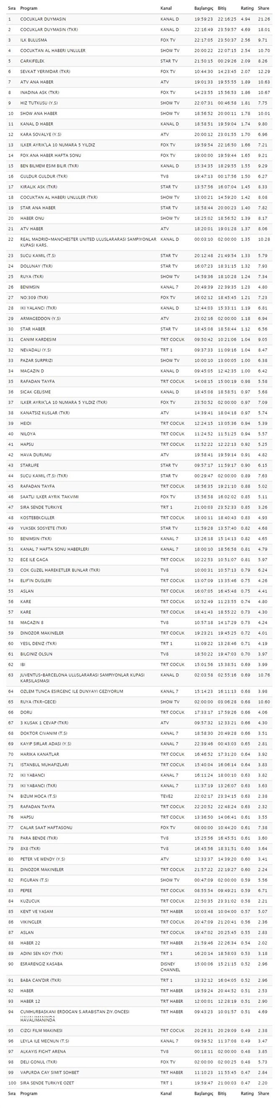 Total ve Ab'de Çocuklar Duymasın tekrar bölümü ikinci sırada yer aldı. Total'de 18.01 share aldı, Ab'de 18.16 share ile ikinci sırada yer aldı.