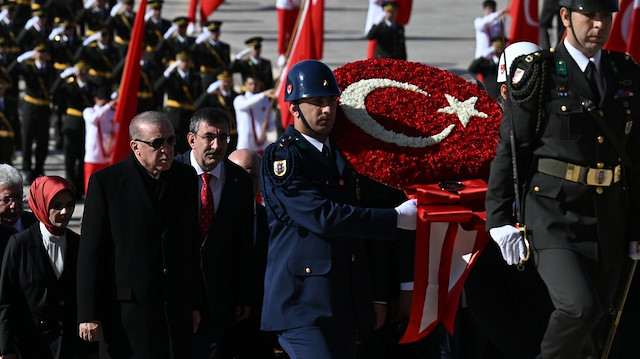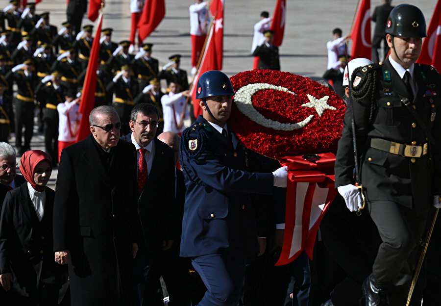 Cumhurbaşkanı Erdoğan'ın, üzerinde ay yıldız bulunan çelengi Atatürk'ün mozolesine bırakmasının ardından saygı duruşunda bulunuldu ve İstiklal Marşı okundu.