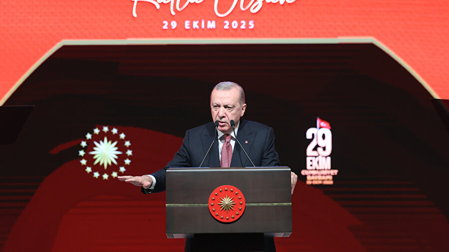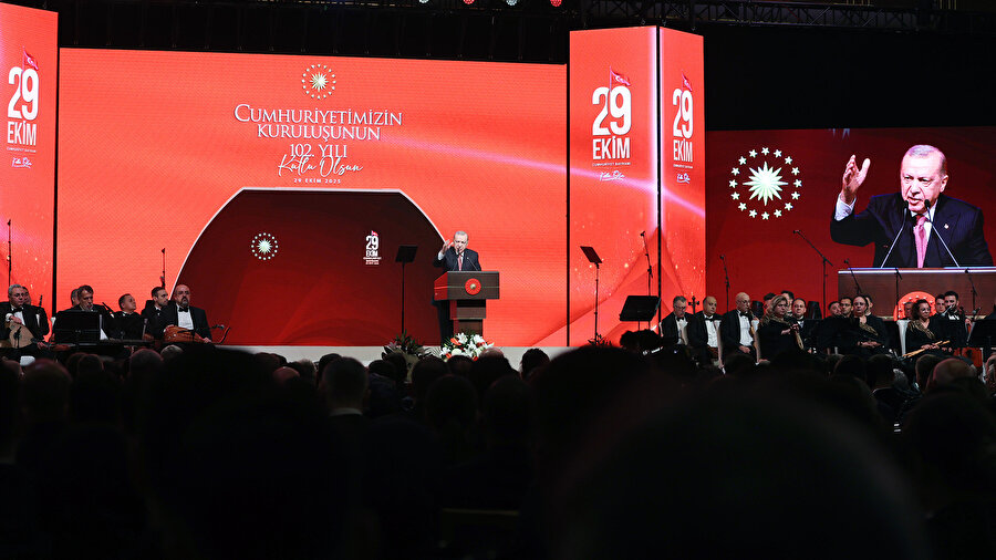 Erdoğan, Cumhurbaşkanlığı Külliyesi Sergi Salonu'nda düzenlenen 29 Ekim Özel Programı'ndaki konuşmasına, tüm vatandaşların 29 Ekim Cumhuriyet Bayramını tebrik ederek başladı.