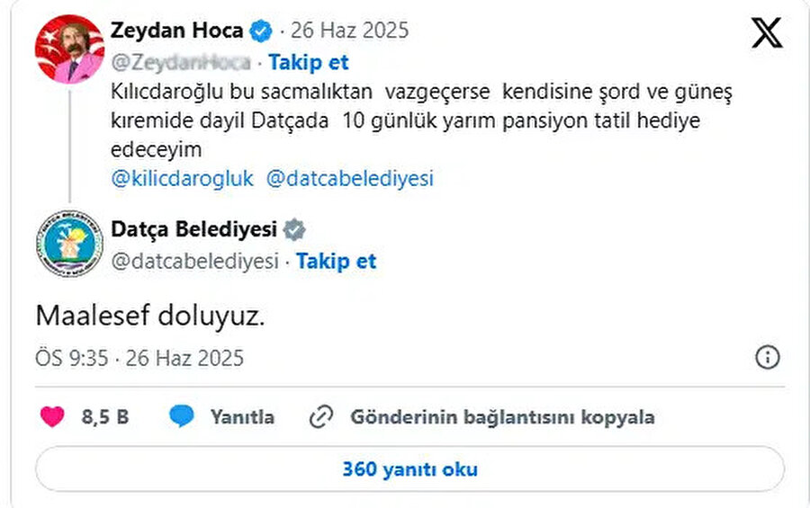 Muğla’nın Datça ilçesinde belediyenin X hesabını yöneten Osman Akın’ın görevine son verildi. Sosyal medyada yaptığı paylaşımlar sayesinde sık sık gündeme gelen ve kamuoyunun beğenisini kazanan Akın, ayrılığıyla ilgili yaptığı açıklamada “İçim çok rahat, ilçeye ve kuruma aldığımdan fazlasını verdim” ifadelerini kullandı. Konuya ilişkin eski CHP Genel Başkanı Kemal Kılıçdaroğlu'ndan açıklama geldi.