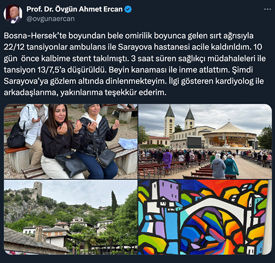 "Bosna-Hersek’te boyundan bele omirilik boyunca gelen sırt ağrısıyla 22/12 tansiyonlar ambulans ile Sarayova hastanesi acile kaldırıldım. 10 gün önce kalbime stent takılmıştı. 3 saat süren sağlıkçı müdahaleleri ile tansiyon 13/7,5’a düşürüldü. Beyin kanaması ile inme atlattım. Şimdi Sarayova’ya gözlem altında dinlenmekteyim. İlgi gösteren kardiyolog ile arkadaşlarıma, yakınlarıma teşekkür ederim."