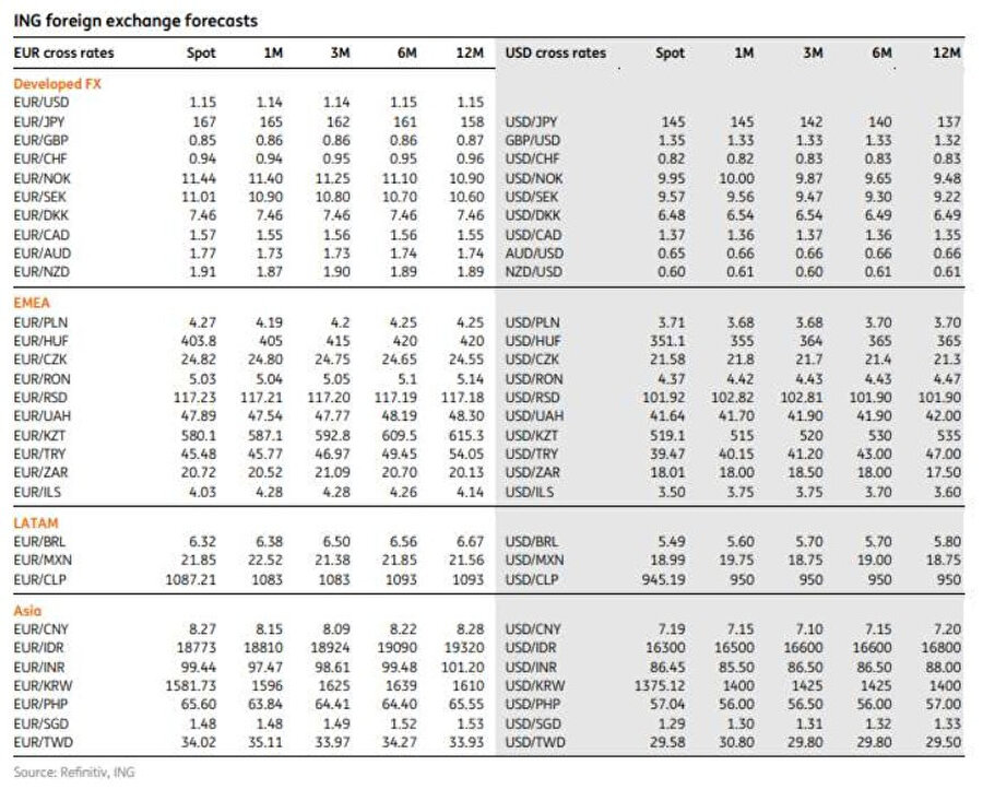 Dolar/TL’nin gelecek 1, 3, 6 ve 12 ayda sırasıyla 40,15, 41,20, 43,00 ve 47,00 olmasını bekleyen ING, Euro/TL’nin gelecek 1, 3, 6 ve 12 ayda sırasıyla 45,77, 46,97, 49,45 ve 54,05 olacağını tahmin etti.