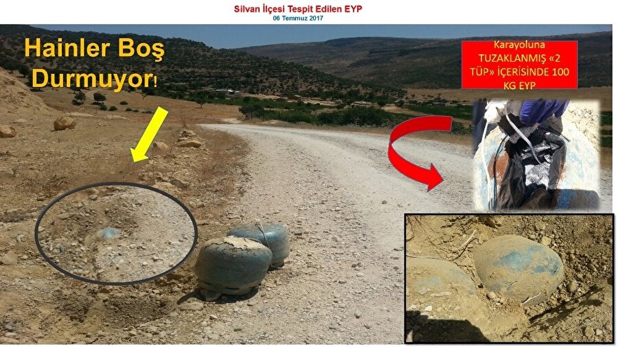 Öte yandan Silvan ilçesi Demirkuyu köyü mevkiinde bulunan stabilize yola teröristlerce mayın/el yapımı patlayıcı (EYP) yerleştirildiğine ilişkin elde edilen istihbari bilgiye istinaden 05 Temmuz 2017 Çarşamba günü saat 21.00’dan itibaren düzenlenen operasyonda, 2 adet 12 kilogramlık tüp içerisinde yaklaşık 100 kilogram amonyum nitrat kullanılarak hazırlanmış EYP düzeneği tespit edildiği ve delil olabilecek bulguların muhafaza altına alınıp, mayın/EYP düzeneğinin Patlayıcı Madde İmha Timi tarafından emniyetli bir şekilde tahrip edildiği imha edildiği ifade edildi.