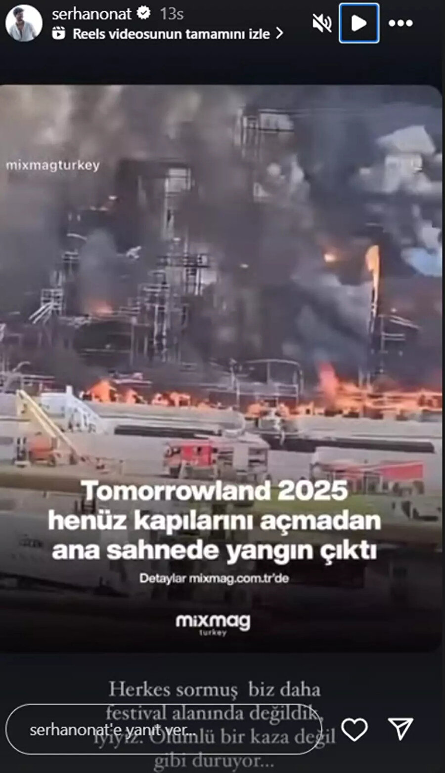 Tomorrowland'in ana sahnesi, çıkan yangında küle döndü. Evlilik hazırlığı yaptığı Merve Küsmenoğlu ile Belçika'da olan genç oyuncu Serhan Onat'ın da orada olduğu öğrenildi. Onat, "Ölümlü bir kaza değil gibi duruyor" ifadelerini kullandı.