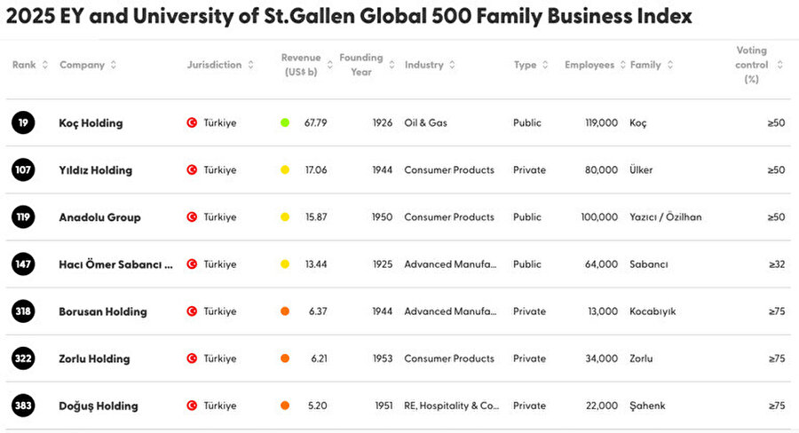 EY ve St. Gallen Üniversitesi işbirliğiyle hazırlanan 'Küresel 500 Aile Şirketi Endeksi'ni yayımlandı. Koç Holding, bu listede ilk 20'ye giren ilk Türk aile şirketi oldu. Listede Türkiye'den Yıldız Holding, Anadolu Grubu, Hacı Ömer Sabancı Holding, Borusan Holding, Zorlu Holding ve Doğuş Holding de yer aldı.