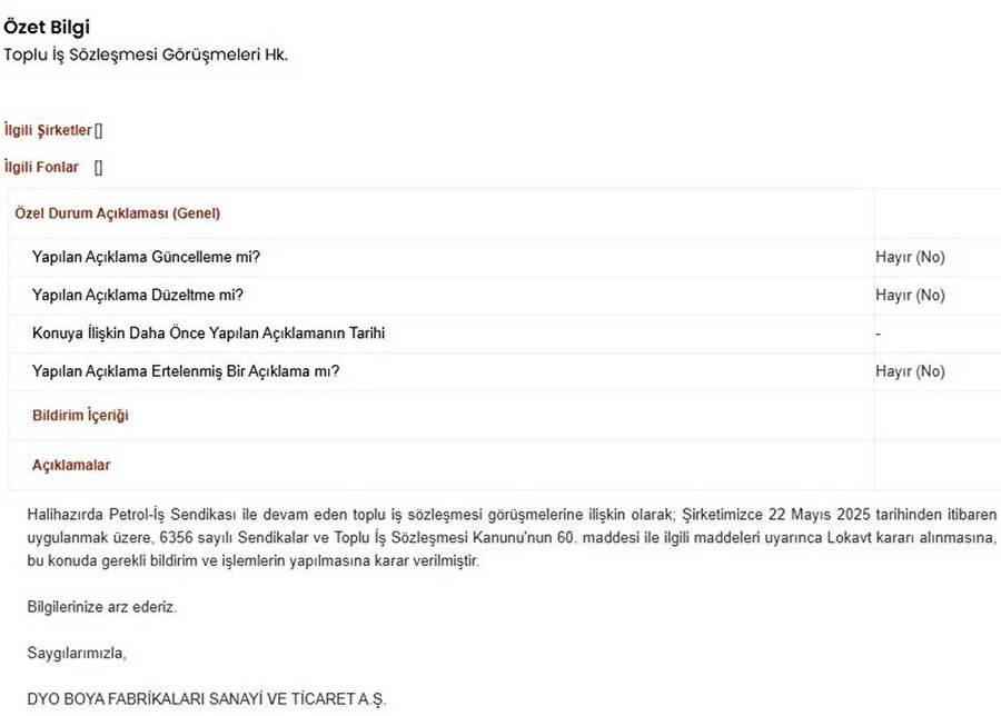 - "Halihazırda Petrol-İş Sendikası ile devam eden toplu iş sözleşmesi görüşmelerine ilişkin olarak; Şirketimizce 22 Mayıs 2025 tarihinden itibaren uygulanmak üzere, 6356 sayılı Sendikalar ve Toplu İş Sözleşmesi Kanunu'nun 60. maddesi ile ilgili maddeleri uyarınca Lokavt kararı alınmasına, bu konuda gerekli bildirim ve işlemlerin yapılmasına karar verilmiştir."