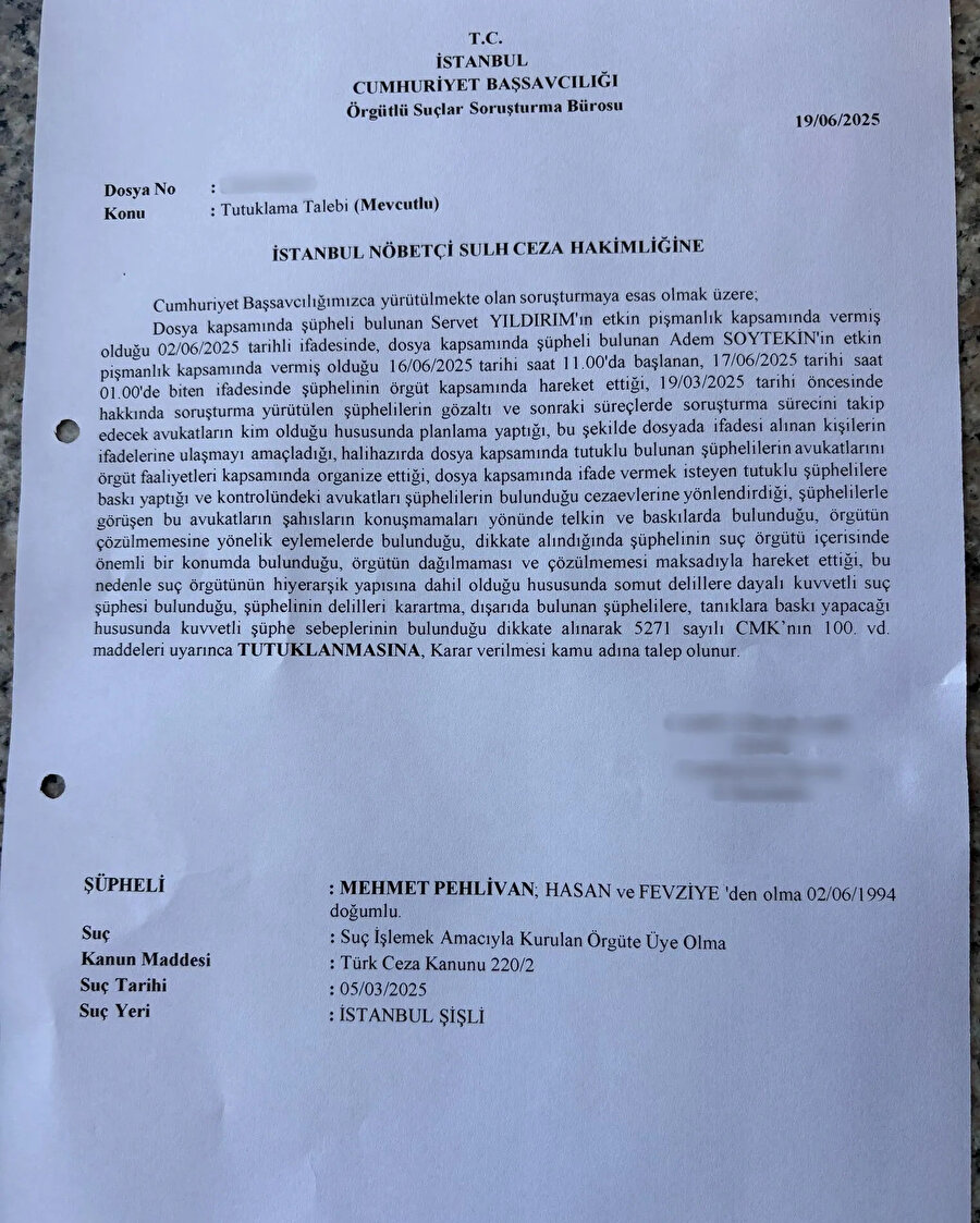 Pehlivan, Avukatlık Kanunu gereği Adalet Bakanlığı’ndan soruşturma izni istenmediği için savcılıkta ifade vermeyi reddetti. Etkin pişmanlıktan yararlanan Servet Yıldırım ve Adem Soytekin’in ifadelerine dayandırılarak “suç örgütü adına” hareket ettiği iddia edilen Pehlivan, kuvvetli suç şüphesi gerekçesi ile tutuklama talebi ile nöbetçi mahkemeye sevk edildi.