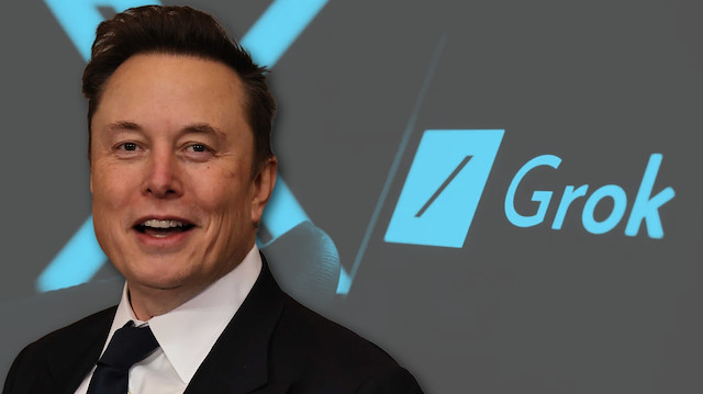 Grok fotoğrafının önünde duran Elon Musk