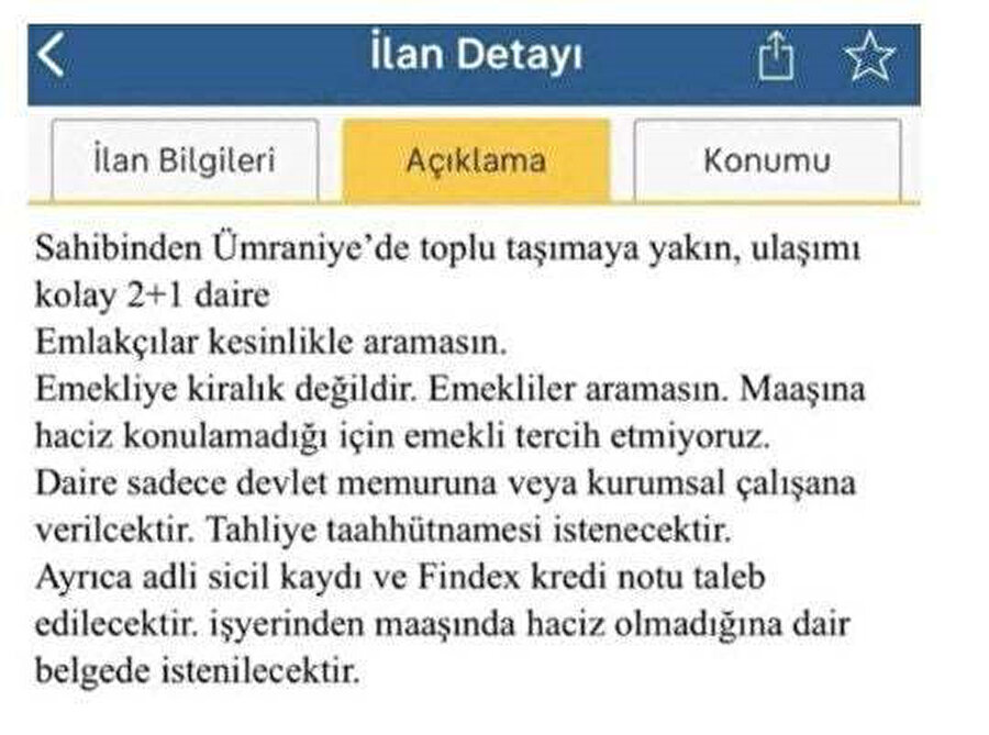 Ticaret Bakanlığı Basın Danışmanı Bekir Kaplan X hesabında yaptığı bir paylaşımla 'ayrımcı konut ilanına' idari para cezası uygulandığını açıkladı. Ayrıca ilan yayından da kaldırıldı. İşte o paylaşım ve ilanda yazan ilginç detay...