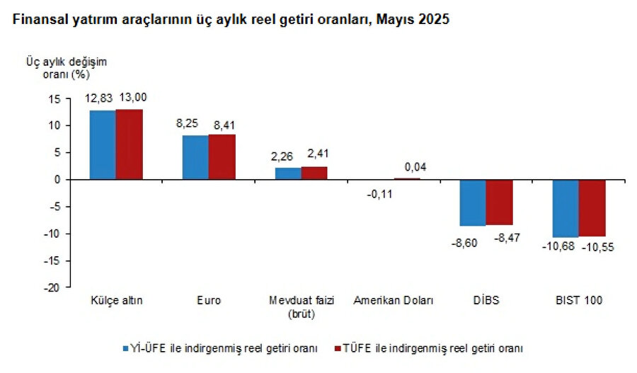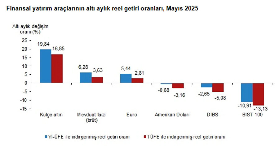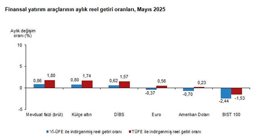 Türkiye İstatistik Kurumu (TÜİK) mayıs ayına ilişkin finansal yatırım araçlarının reel getiri oranlarını açıkladı. Buna göre mayıs ayında finansal yatırım araçları arasında en yüksek aylık reel getiri mevduat faizinde gerçekleşti. Üç aylık, altı aylık ve yıllık değerlendirmelerde ise yatırımcısına en yüksek reel getiri sağlayan yatırım aracı külçe altın oldu.