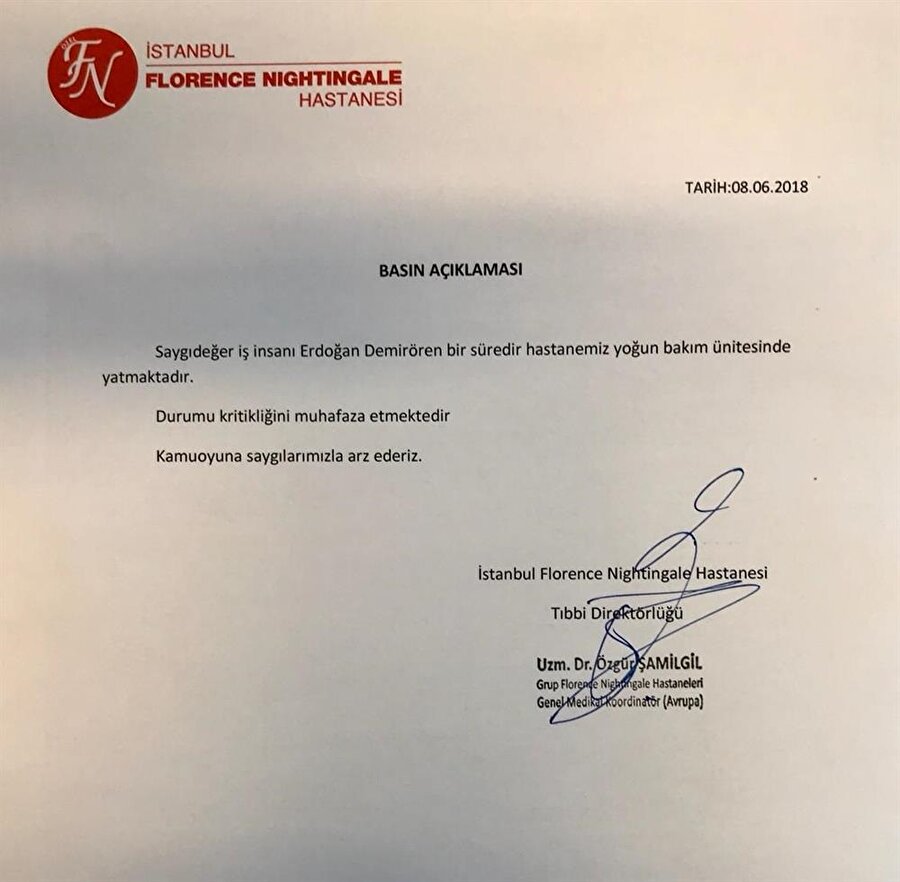 Aldığımız bilgiye göre Demirören, dün akşam saatlerinde rahatsızlanarak Çağlayan'da bulunan Florance Nightingale Hastanesi'ne kaldırıldı. Yenisafak.com'un ulaştığı hastane yetkilileri Erdoğan Demirören'in durumunun stabil olduğunu ve vefat gibi bir durumun olmadığını söyledi. Hastaneden de bir açıklama yapılacağı kaydedildi.