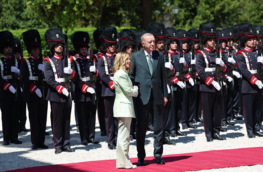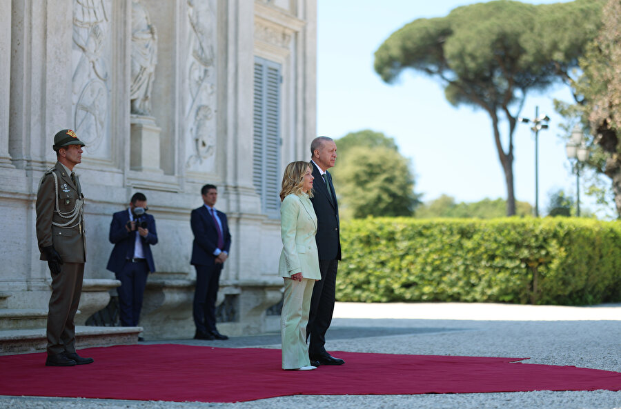 Cumhurbaşkanı Recep Tayyip Erdoğan, İtalya Başbakanı Giorgia Meloni davetine icabetle başkent Roma’ya geldi. Cumhurbaşkanı Erdoğan ve beraberindeki heyet, Roma Fiumicino Leonardo da Vinci Uluslararası Havalimanı’nda İtalya Protokol Müdürü Bruno Pasquino ile Türkiye’nin Roma Büyükelçisi Elif Çomoğlu Ülgen ve eşi Sinan Ülgen, Milano Başkonsolosu Mehmet Özöktem, Vatikan Büyükelçiliği Geçici Maslahatgüzarı Neslihan Altay ve Roma Büyükelçiliği personeli tarafından karşıladı. Cumhurbaşkanı Erdoğan havalimanının ardından Meloni’nin resmi görüşmelerini gerçekleştirdiği Villa Doria Pamphili’ya geçti. Cumhurbaşkanı Erdoğan, Villa Doria Pamphili’da İtalya Başbakanı Giorgia Meloni tarafından resmi törenle karşılandı. Cumhurbaşkanı Erdoğan, resmi karşılama töreninde karşılama kıtasını karşıladı.