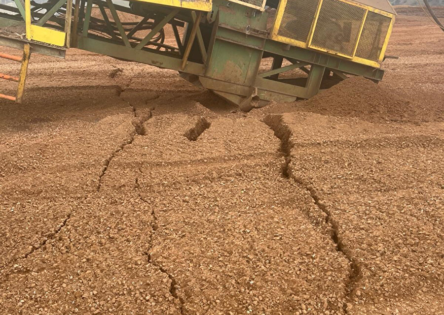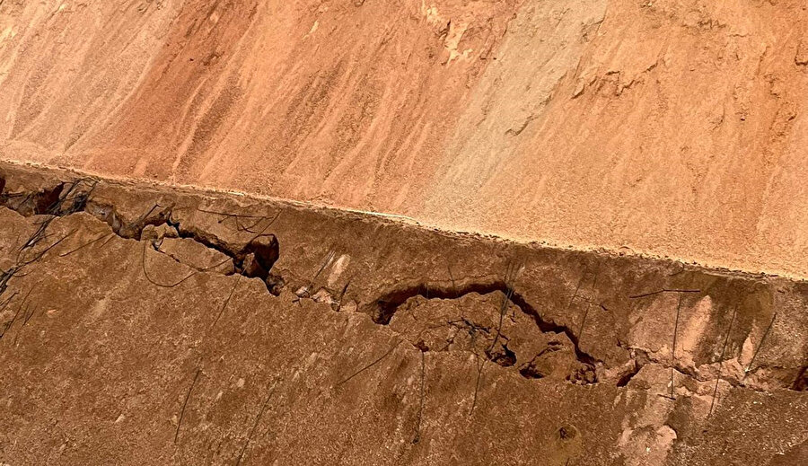 Fotoğraflarda, yığın liç alanında biriktirilen topraklarda derin yarıkların oluştuğu görülüyor.