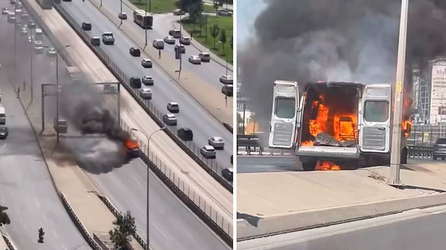 Esenyurt E5 Karayolu'nda seyir halindeyken alev alan kamyonet, trafikte panik yarattı. Alevler içinde ilerleyen araç, olası bir faciaya davetiye çıkardı. Yangın anı saniye saniye kameraya yansıdı.