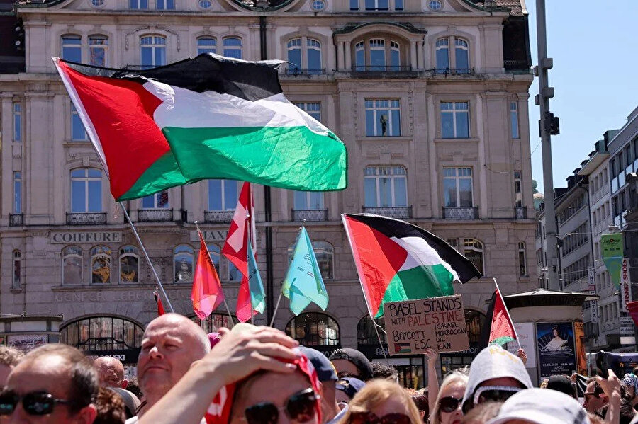 Basel Belediye Binası önünde 11 Mayıs'ta gerçekleştirilen Eurovision Şarkı Yarışması'nın resmi açılış törenine, İsrail karşıtı ve Filistin destekçisi gösteriler damga vurmuştu.