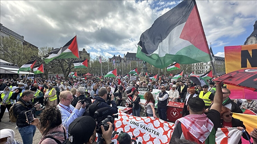 Tören için belediye binası önünde toplanan binlerce kişilik kalabalık arasında çok sayıda Filistin destekçisi aktivist de yerini almıştı.
