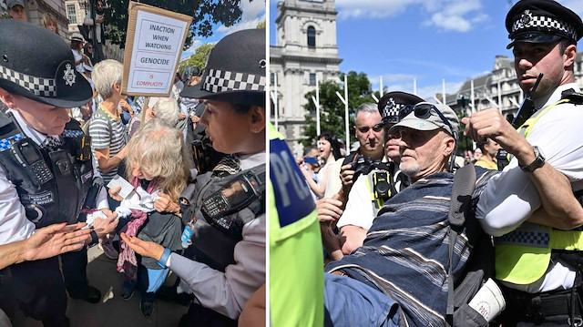 İsrail’in Gazze Şeridi’ndeki katliamlarına ve bölgeyi işgal planına tepkiler sürerken, bu kez İngiltere’nin başkenti Londra Filistin’e destek gösterilerine sahne oldu. Parlamento Meydanı ve Whitehall bölgesinde toplanan yüzlerce gösterici, İngiltere’de yasaklanan "Palestine Action" grubuna destek vererek İsrail’in Gazze’ye yönelik saldırılarına tepki gösterdi. "Soykırıma karşıyım", "Filistin Hareketi’ni destekliyorum", "Gazze’den ellerinizi çekin" ve "Protesto hakkını savun" pankartları taşıyan göstericilere polisin müdahalesi ise sert oldu. Londra Metropolitan Polisi’nden yapılan açıklamada, "Palestine Action" hareketinin yasaklı gruplardan biri olduğu hatırlatılarak, gösterilere katılan 466 kişinin gözaltına alındığı bildirildi. Ayrıca 5’i polis memurlarına saldırı olmak üzere farklı suçlardan 8 kişinin gözaltına alındığı aktarıldı.