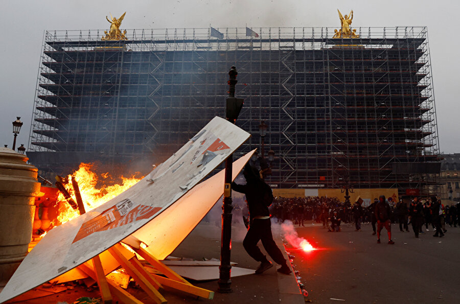 Göstericilerden bazıları Paris sokaklarındaki çöp ve çöp bidonlarını ateşe verdi, otobüs duraklarını tahrip etti.