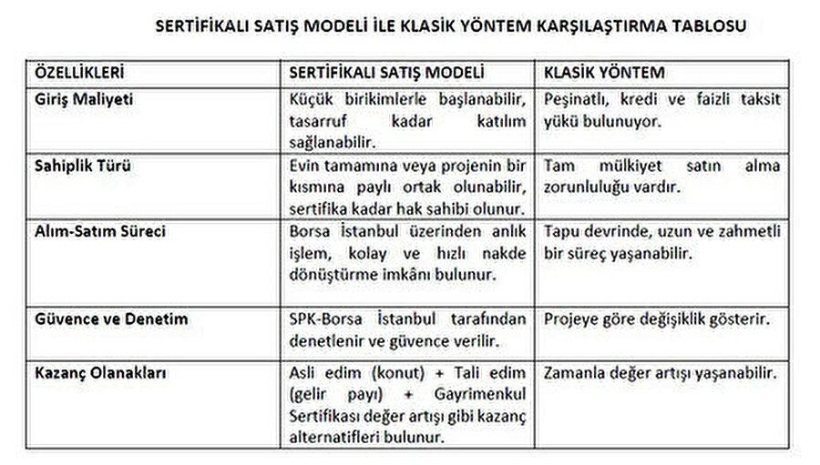 Sertifikalı satış modeli ile klasik yöntem karşılaştırma tablosu: