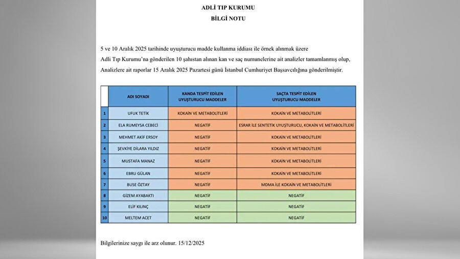 Ünlülere yönelik uyuşturucu operasyonu kapsamında tutuklanan eski Habertürk Genel Yayın Yönetmeni Mehmet Akif Ersoy'un verdiği uyuşturucu testinin sonucu "pozitif" çıktı. Öte yandan spiker Ela Rumeysa Cebeci'nin "kokain" ve "esrar" testleri pozitif çıktı.