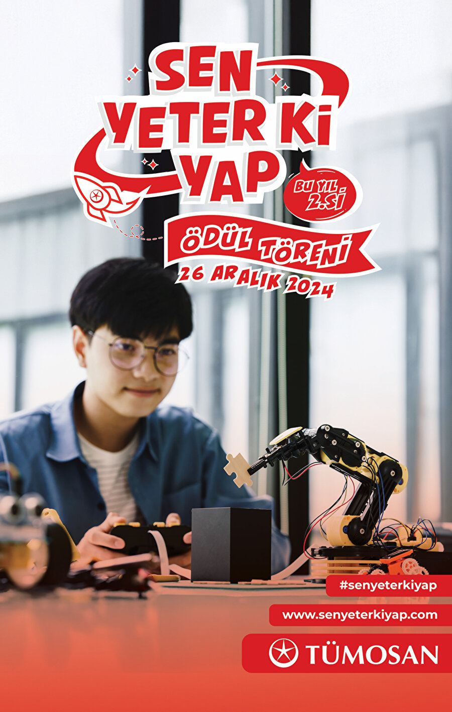 Geçtiğimiz yıl büyük ilgi gören ve başarılı projelere ev sahipliği yapan “Sen Yeter Ki Yap”, bu yıl da genç mucitlerin inovatif çözümlerini desteklemeye devam ediyor. Türkiye’nin yerli ve millî motor ve traktör üreticisi TÜMOSAN, genç mucitlere destek olmak için bu yıl ikincisini düzenlediği “Sen Yeter Ki Yap” yarışmasının jüri sürecini tamamladı. Genç mucitlerin büyük bir ilgi gösterdiği yarışmaya yapılan yüzlerce başvuru arasından ödül kazanan isimler alanında uzman isimler tarafından derecelendirildi. Ortaokul ve lise öğrencilerinin büyük bir heyecanla beklediği “Sen Yeter Ki Yap” ödül töreni için artık sayılı günler kaldı. Çeşitli etkinliklere sahne olacak tören günü, 26 Aralık Perşembe, Fatih Kültür Sanat Merkezi’nde gerçekleşecek.