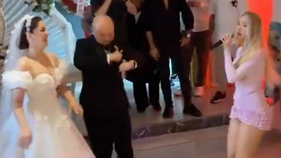 Gelin ve damatla birlikte şarkı söyleyen ünlü şarkıcı mütevazı tavırlarıyla dikkat çekti.