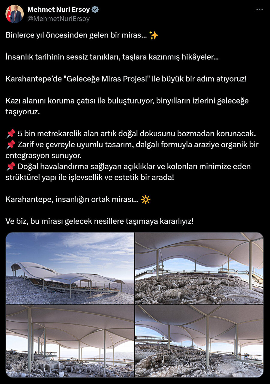 İnsanlık tarihinin sessiz tanıkları, taşlara kazınmış hikâyeler... Karahantepe’de "Geleceğe Miras Projesi" ile büyük bir adım atıyoruz! Kazı alanını koruma çatısı ile buluşturuyor, binyılların izlerini geleceğe taşıyoruz. 5 bin metrekarelik alan artık doğal dokusunu bozmadan korunacak. Zarif ve çevreyle uyumlu tasarım, dalgalı formuyla araziye organik bir entegrasyon sunuyor. Doğal havalandırma sağlayan açıklıklar ve kolonları minimize eden strüktürel yapı ile işlevsellik ve estetik bir arada! Karahantepe, insanlığın ortak mirası… Ve biz, bu mirası gelecek nesillere taşımaya kararlıyız!"
