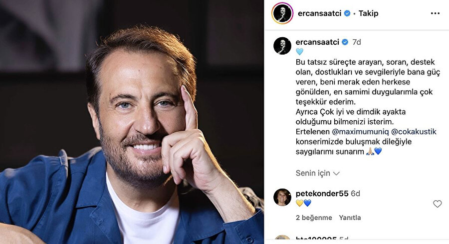 "Bu tatsız süreçte arayan, soran, destek olan, dostlukları ve sevgileriyle bana güç veren, beni merak eden herkese gönülden, en samimi duygularımla çok teşekkür ederim. Ayrıca çok iyi ve dimdik ayakta olduğumu bilmenizi isterim. Ertelenen konserimizde buluşmak dileğiyle saygılarımı sunarım."