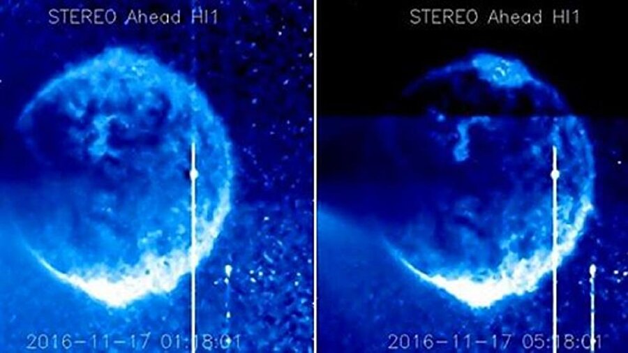 İngiliz Daily Mail gazetesinin haberine göre, söz konusu görüntüleri NASA'nın SECCHI STEREO HI1 uydusundaki kameralar yakaladı. Meksika'da yaşayan Pamela Johnson adlı amatör bir astronom, NASA'nın resmi internet sitesinde yayınlanan görüntüleri incelerken kimsenin dikkat etmediği bir detay yakaladı. Güneş'in 15 Kasım'dan itibaren mavi küreyle reaksiyona girdiğini iddia eden Johnson, sonraki günlerde NASA yayınından bazı karelerin silindiğini ve cismin bir süre sonra yok olduğunu belirtti. Paylaşımı izleyen birçok YouTube kullanıcısı, gezegen benzeri yapının hareket etmediğini ancak bir süre sonra tamamen yok olduğunu, arada “silinen” görüntü kareleri olduğunu savundu.